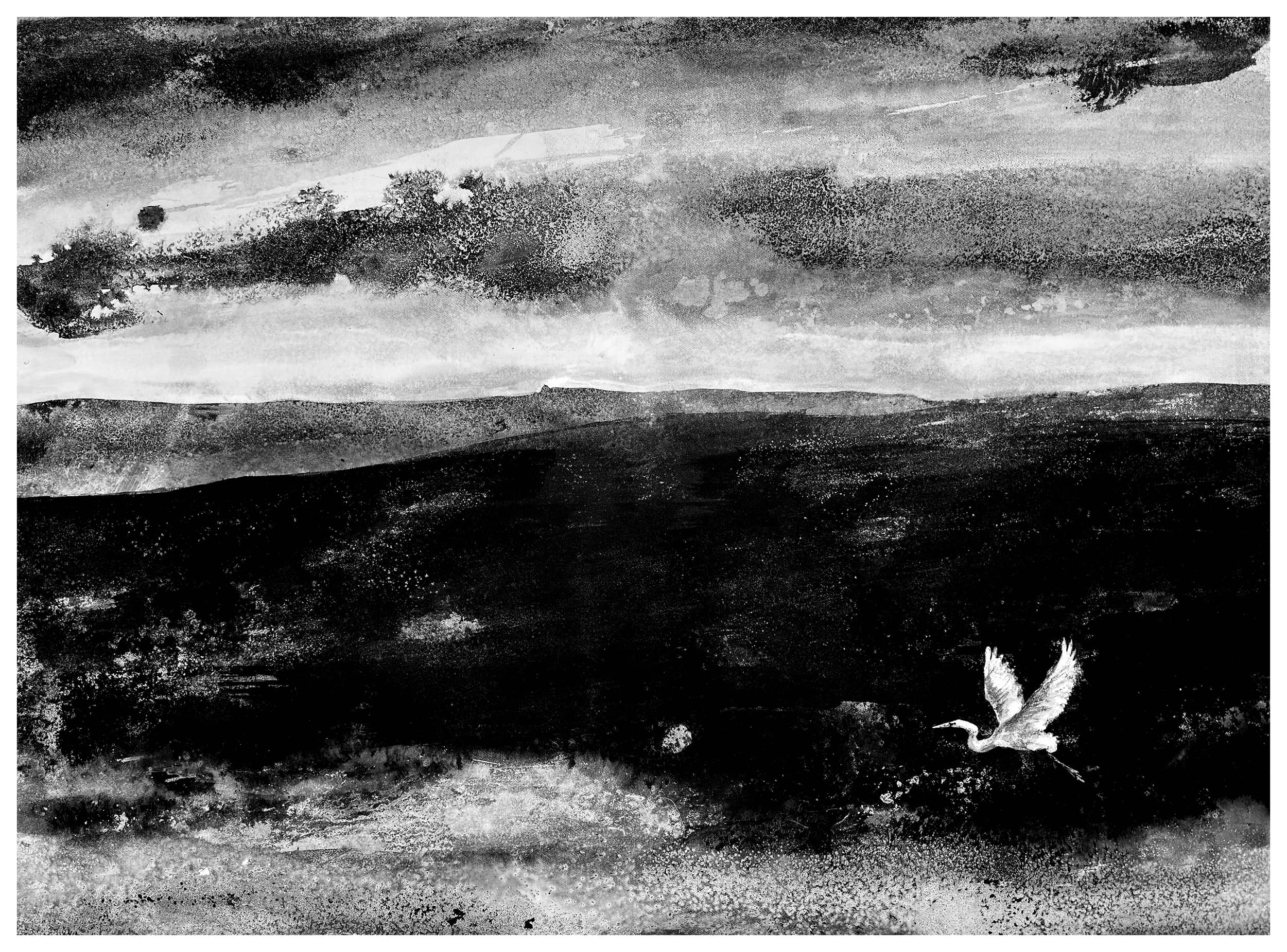 A flying great egret against a Black Mountains backdrop, where they sometimes overwinter. The original is painted with ink and salt on 600 gsm Italian paper with a rough edge. The print is from a high resolution photograph, tonally corrected and enhanced so that all the textures and marks of the original are preserved.